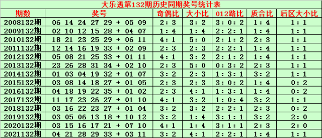 大乐透第132期历史同期奖号分析: