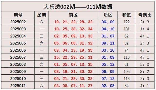 大乐透第2025011期出奖号统计:前区03、06、07、11、27,后区02、08。和值为54,奇偶比4:1。