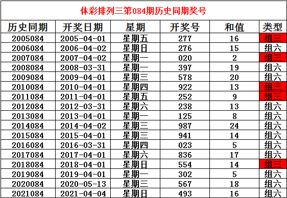 2022年4月4日排列三第084期开奖,历史同期分别开出奖号: