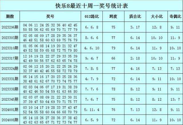 福彩快乐8第2024008期(上周一)开奖回顾:05 14 18 26 27 28 36 37 38 42 43 62 63 65 67 71 72 73 74 77,其中奖号012路比为6:5:9,跨度为72,质合比为6:14,大小比为11:9,奇偶比为10:10。