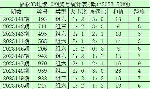 开奖回顾:福利彩票3D第23150期奖号开出247。奖号类型为组六,奇偶形态为偶偶奇,大小形态为小小大。