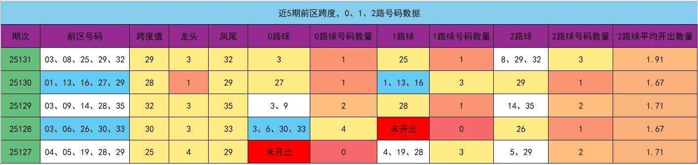 012路比: 上期0路开出1枚(03),1路开出1枚(25),2路开出3枚(08, 29, 32)。本期关注1路号码回补,推荐比例 2:2:1。