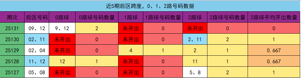 和值: 上期后区和值21(极高)。本期预计大幅回落,参考范围 7-10。