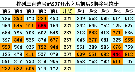 四、排列三直选号码237历史上开出8次,其前后五期奖号分别为: