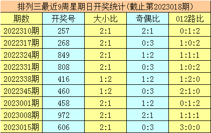 三、体彩排列三前9周星期日奖号分别开出:257-268-849-808-416-460-458-972-606,其中号码012路比为10:7:10,奇偶比为7:20,大小比为16:11;