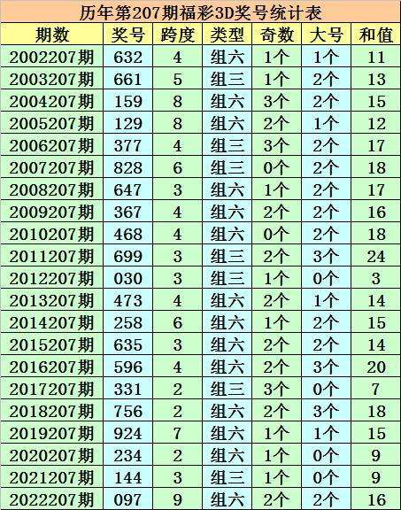 历年第207期福彩3D同期奖号为:632 - 661 - 159 - 129 - 377 - 828 - 647 - 367 - 468 - 699 - 030 - 473 - 258 - 635 - 596 - 331 - 756 - 924 - 234 - 144 - 097。