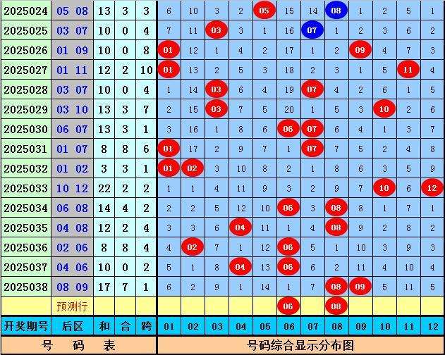 后区上期开出奖号08和09,该组合历史上出现了43次,其下期奖号频次分别为:号码12出现10次,01出现9次,03、09、10、11出现8次,06、07出现7次,02、05、08出现5次,04出现4次,本期后区参考号码05、06、08、12,精选两码06和08。