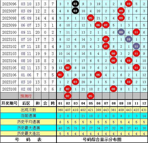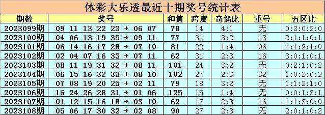 上期开奖:大乐透第2023108期奖号为:05 06 17 30 32 + 02 08,前区号码和值为90,跨度为27,奇偶比为2:3,无重号,五区比为2:0:1:0:2。