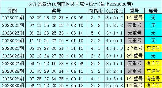 上期回顾:体彩大乐透第2023030期奖号为:06 11 12 20 35 + 05 12,其中前区号码012路比为2:0:3,奇偶比为2:3,包含1个重复号码:35。后区号码和值为17,跨度为7。