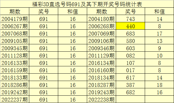 二、组选分析:历史上组选号码691开出了45次,其下期奖号分别为:258-054-802-563-251-743-743-884-107-854-102-002-440-441-683-343-196-047-580-603-827-771-082-098-838-333-503-927-170-165-587-807-729-107-393-017-690-202-617-387-682-886-822-181,其开出期数和下期奖号统计为: