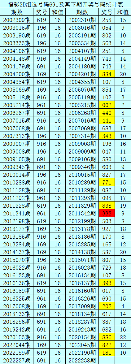 一、开奖回顾:第2022237期福彩3D奖号为691。奖号奇偶比为2:1,和值为:16,跨度为:8。