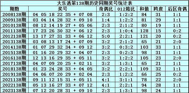 水镜体彩大乐透第2024138期历史同期奖号分析: