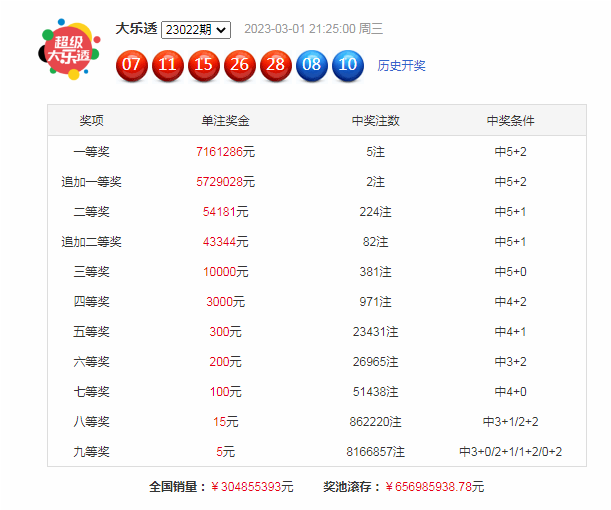 上期开奖:体彩大乐透第2023022期回顾:奖号为07、11、15、26、28+08、10,前区和值为87,首尾和为35,012路比为1:2:2。