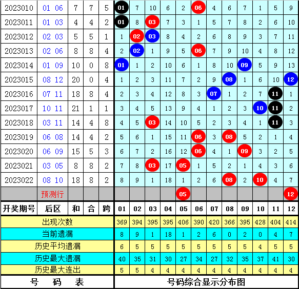 二、后区预测:后区上期开出号码08、10,为热码+热码,目前后区遗漏值4以内的热码有7个:03、05、06、08、09、10、11;遗漏值5-11之间的温码有4个:01、02、07、12;遗漏值12以上的冷码有1个:04、本期注意热码+温码组合开出,两码看好05、12。