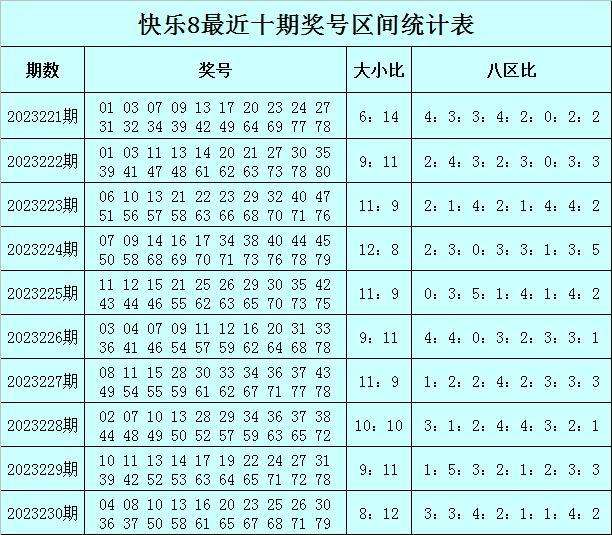 福彩快乐8第2023230期奖号为:04 08 10 13 16 20 23 25 26 30 36 37 50 58 61 65 67 68 71 79,其中奖号大小比为8:12,八区比为3:3:4:2:1:1:4:2。