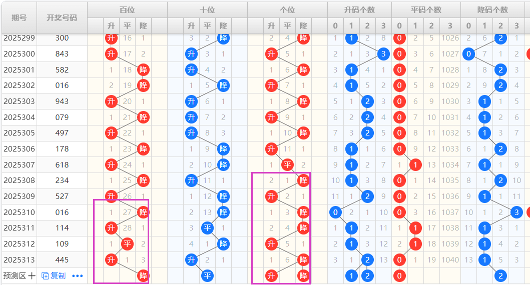 【排列3个位】:近十期升降走势为:降-升-平-降-升-降-降-升-降,为一种单一加重复性的交错走势,结合走势图可以看出,图中紫色框圈出为一种M形态的出球方式,本期可以重点看好升的形态号码的开出。