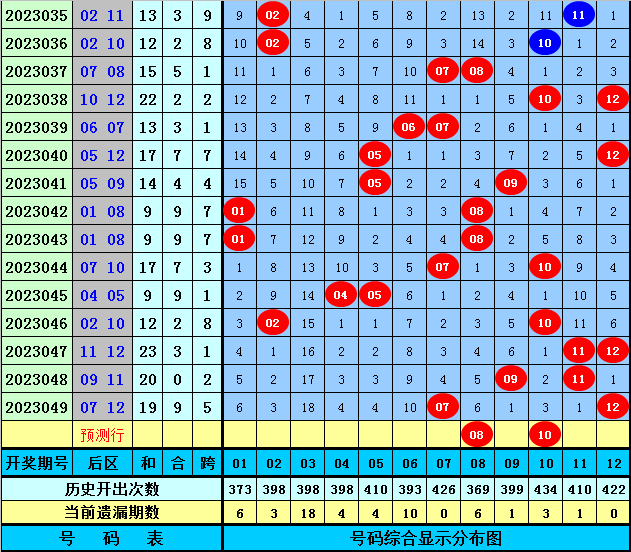 后区分析(定义:01-04为一区,05-08为二区,09-12为三区):上期后区开出奖号07和12,分别出现在第二区和第三区和区,最近10期后区三个区间落号个数比为4:7:9,本期后区注意第二区和第三区号码出现,关注两码08、10。