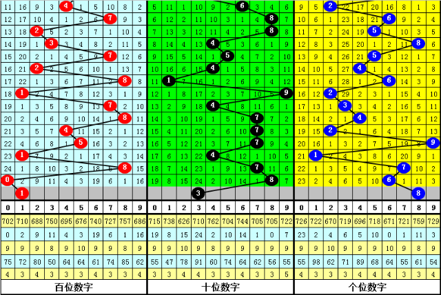 和值分析:最近5期奖号和值分布在6-22之间,波动了17个点位,波动范围较大,上期开出和值14,下降了8个点位,本期看好和值下降,参考和值12。