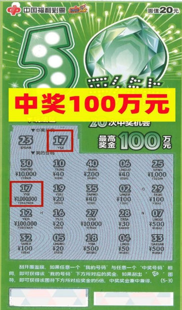 玩法二:刮开覆盖膜,如果任意一个“我的号码”与任意一个“中奖号码”相同,即可获得该“我的号码”下方所对应的奖金。中奖奖金兼中兼得。