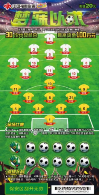 该款彩票面值为20元,共分11个奖级,最高奖金100万元,有30次中奖机会,中奖奖金兼中兼得。游戏玩法有两种,玩法区设计分别采用足球“对阵阵容”和“点球道具”元素,呼应“全场比赛”和“点球大战”,对应采用刮开图符即中和号码比对玩法,更加贴合彩票主题且富有乐趣。