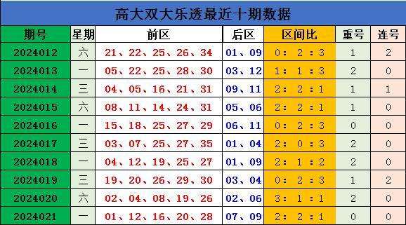 上期回顾,大乐透第2024021开奖,本期奖号:前区01 12 16 20 28;后区07 09,当期前区号码大小比为2:3,三区比2:2:1,奇偶比1:4。前区未开出连号,未开出重号。