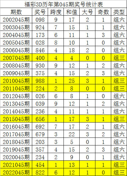 从以上统计可以看出,历年3D第046期开出了7次组三号码,开出了13次组六号码。组三号码和组六号码基本相当,本期预计开出组六号码。
