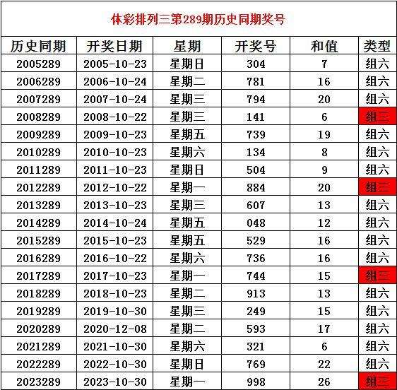 2024年10月29日排列三第289期开奖,历史同期分别开出奖号: