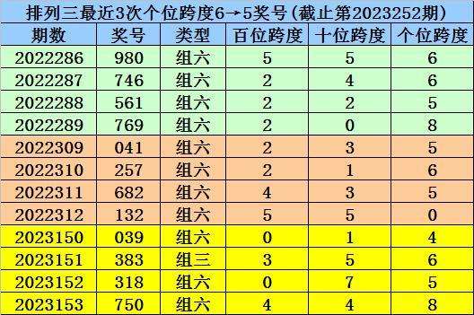 末位跨度分析:前3期末位奖号为0-6-1,最近两期末位奖号跨度为6、5,末位奖号跨度历史上连续两期开出6、5的现象共50次,其最近两次奖号为: