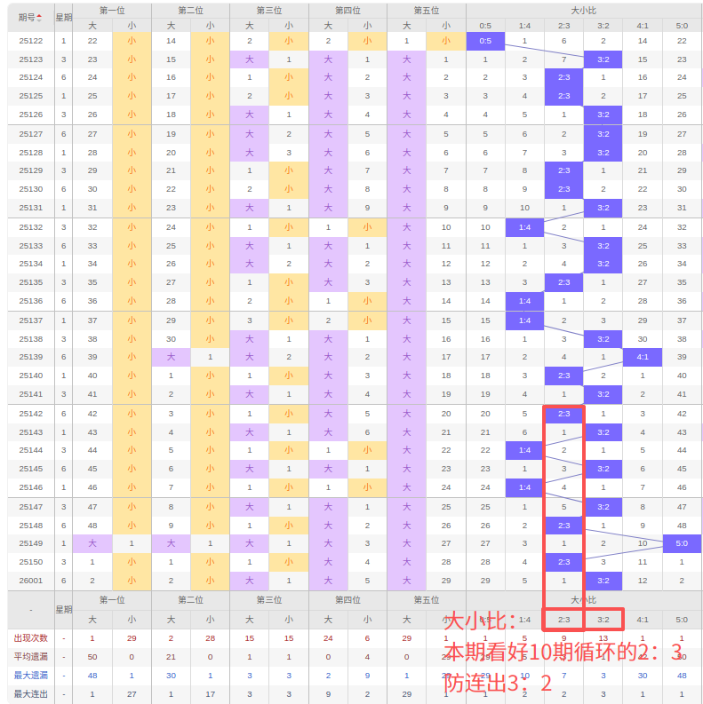 上期大小比:3:2,近10期大小比出现情况:2:3、3:2、1:4、3:2、1:4、3:2、2:3、5:0、2:3、3:2,最近10期出现4期3:2,出现3期2:3,出现0期4:1,出现2期1:4,出现1期5:0,出现0期0:5,根据近10期规律本期看好10期循环的的2:3,防连出3:2,综上所述推荐大小比推荐:3:2,重点关注:2:3。