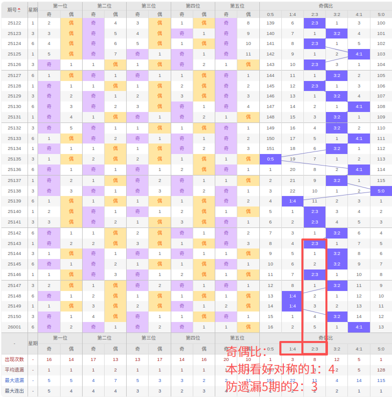 上期奇偶比:4:1,近10期奇偶比出现情况:3:2、2:3、3:2、3:2、2:3、3:2、1:4、1:4、3:2、4:1,最近10期出现5期3:2,出现2期2:3,出现1期4:1,出现2期1:4,出现0期5:0,出现0期0:5,根据近10期规律本期看好对称出1:4,防遗漏5期的2:3,综上所述推荐奇偶比推荐:2:3,重点关注:1:4。