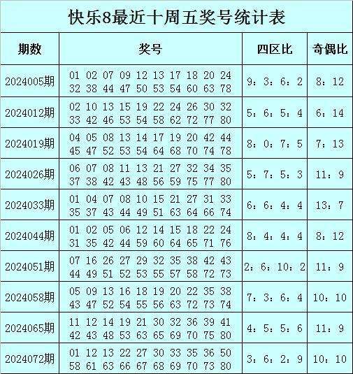 福彩快乐8第2024072期(上周五)开奖回顾:01 12 13 22 27 30 33 35 36 50 58 61 63 66 67 68 69 70 73 80,其中奖号四区比为3:6:2:9奇偶比为10:10。