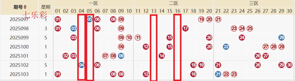 近七期开奖中一区出号数量为4+3+3+1+4+1+3=19枚,整体占比为38.8%;二区出号数量为2+1+3+3+1+2+2=14枚,整体占比为28.6%;三区出号数量为1+3+1+3+2+4+2=16枚,整体占比为32.6%。一区整体占比略高于均值,周期内呈现上升趋势,鉴于整体波动,本期慎防。二区占比最低,呈现上升趋势,本期重点关注。三区占比略低于均值,呈现下降趋势,断区可能性不大。基于动态平衡干预以及波动趋势衡量,本期七乐彩开奖三区比倾向于2:4:1。重点关注周期遗漏的4,5,13,16。