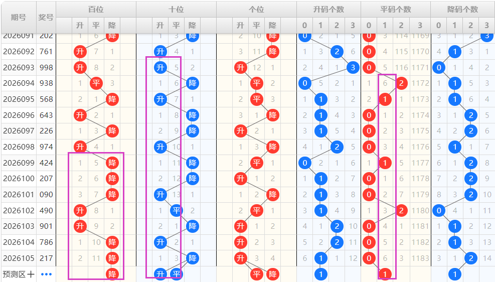 【排列3个位】:近期升降走势为:升-降-平-升-降-平-升-升-升,为一种交错走势,结合走势图可以看出,图中紫色框圈出为一种M形态的出球方式,本期可以重点看好升的形态号码的开出。
