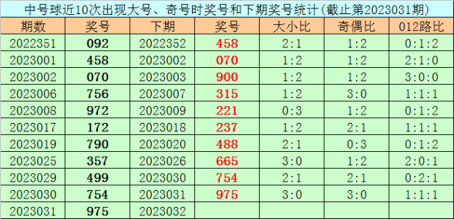 在中号球前10次开出大号、奇号类型之后,其下期分别开出奖号:458、070、900、315、221、237、488、665、754、975,其中号码奇偶比为6:4,大小比为6:4,012路比为3:3:4。