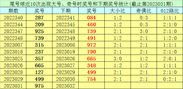 在尾号球前10次开出大号、奇号类型之后,其下期分别开出奖号:084、460、739、491、972、790、665、348、499、754,其中号码012路比为4:3:3,奇偶比为4:6,大小比为4:6。