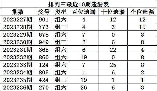 上期回顾:排列三第2023236期奖号:270,组六,直选遗漏总值为35期。