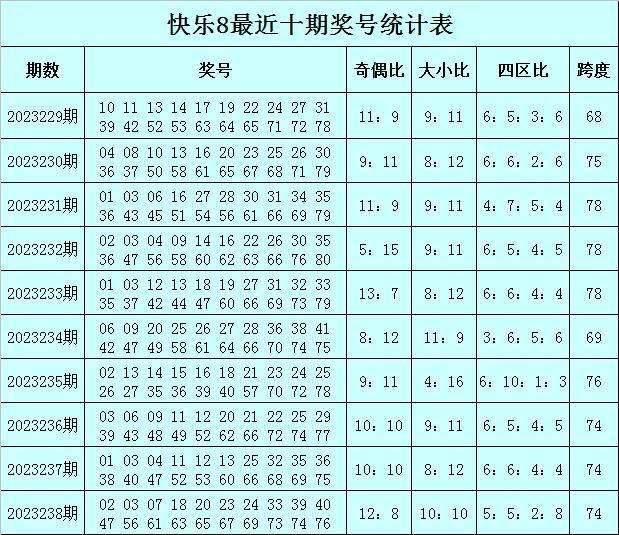 福彩快乐8第2023238期开奖回顾:02 03 07 18 20 23 24 33 39 40 47 56 61 63 65 67 69 73 74 76,其中奖号奇偶比开出12:8,大小比开出10:10,四区比开出5:5:2:8,跨度开出74。
