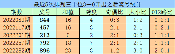 1、最近两期排列三十位号码开出号码分别为3和0,历史上十位号码连续两期同时出现号码3和0的奖号共开出66期。最近五次下期开出号码为:844、457、213、792、896;