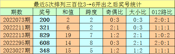 1、排列三最近两期百位号码分别开出3和6,历史上百位号码连续两期分别开出3和6的奖号出现了65期。前五期开出之后其下期奖号分别为:200、321、829、608、348;