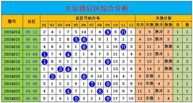 上期后区开出号码05、09,为冷热组合。最近10期后区冷热比7:13,热码整体走势稍热,最近10期后区冷冷组合开出0期,冷热组合开出3期,热冷组合开出4期,热热组合开出3期。
