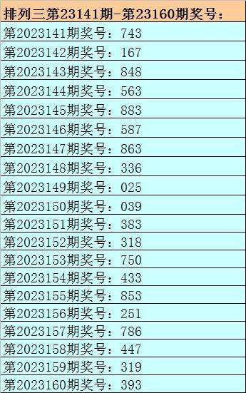开奖回顾:排列三第2023160期开出奖号:393。其中奖号大小比为1:2,奇偶比为3:0,012路比为3:0:0,和值为15,跨度为6。