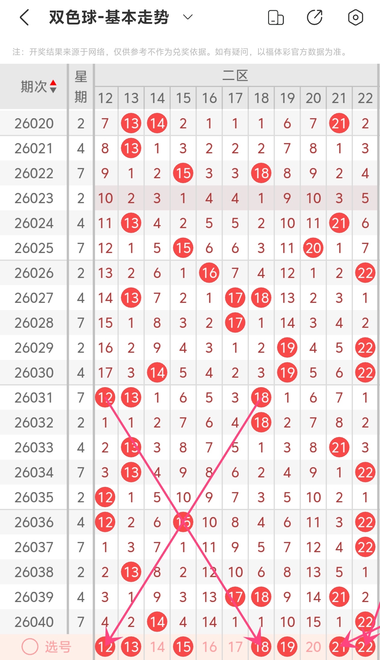 理由:12、13为连号潜在组合;15、18为隔期回补的热门;21、22为上期的重号与邻号。
