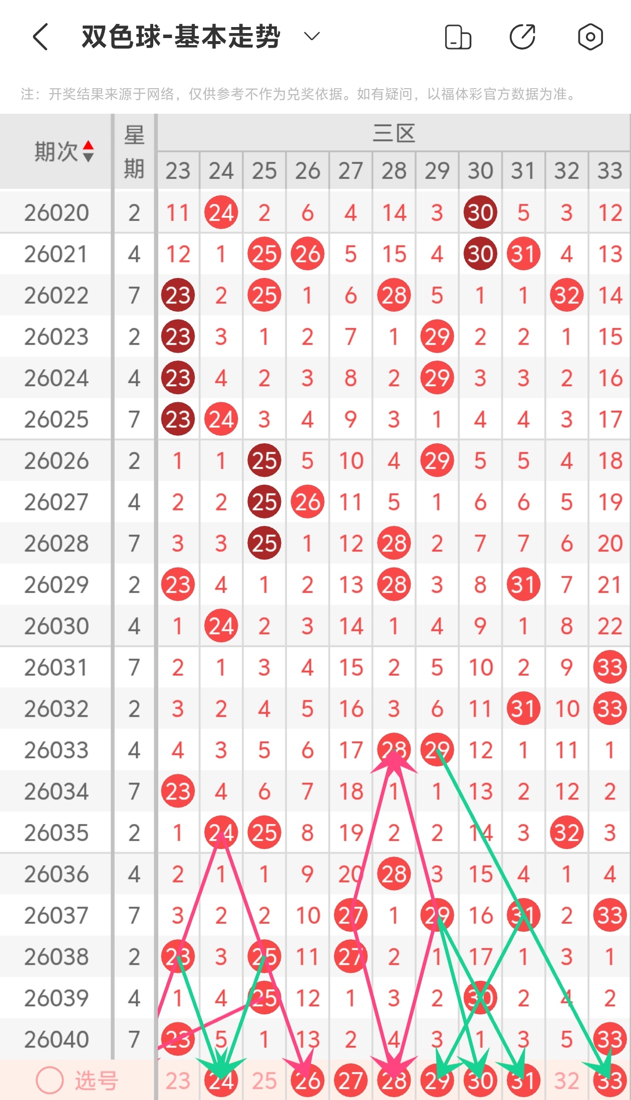 下面双色球的第三区间走势图分析: