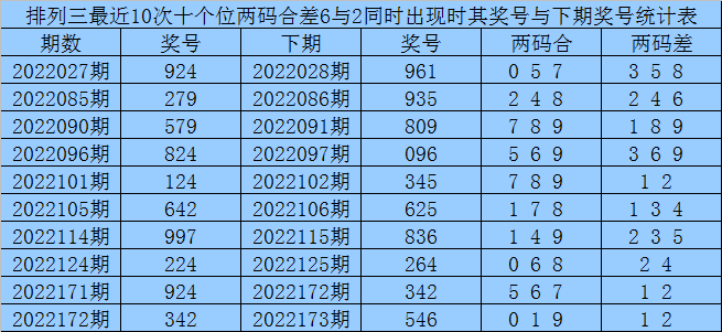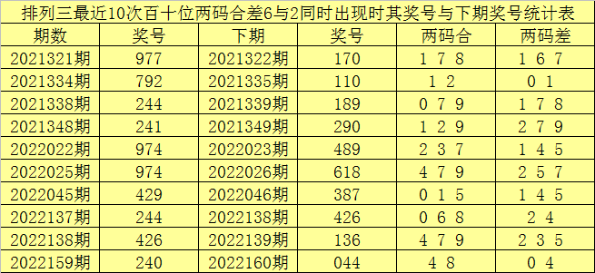 百十位合差分析:上期奖号百十位开出24组合,两码合为6,两码差为2,最近10次百十位两码合6与两码差2同时出现时,其奖号和下期奖号分别为: