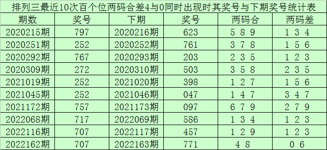 百个位合差分析:上期奖号百个位开出22组合,两码合为4,两码差为0,最近10次百个位两码合4与两码差0同时出现时,其奖号和下期奖号分别为: