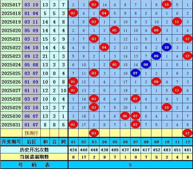 后区第一位推荐:在连续5期开奖中分别出号:01、03、03、06、01,均值为2。8,其中奇数奖号表现相对较热,本期没有转冷的迹象,注意再次出现,关注号码03。