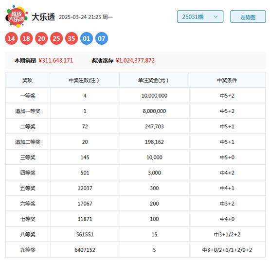 大乐透第2025031期开出奖号为:14、18、20、25、35+01、07。其中前区奇偶比为2:3,三区比为0:3:2,大小比为4:1,后区开出全奇组合。