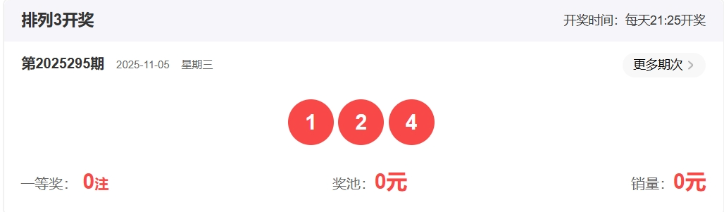 排列三第2025295期开奖回顾:开奖号码:124 形态:组六