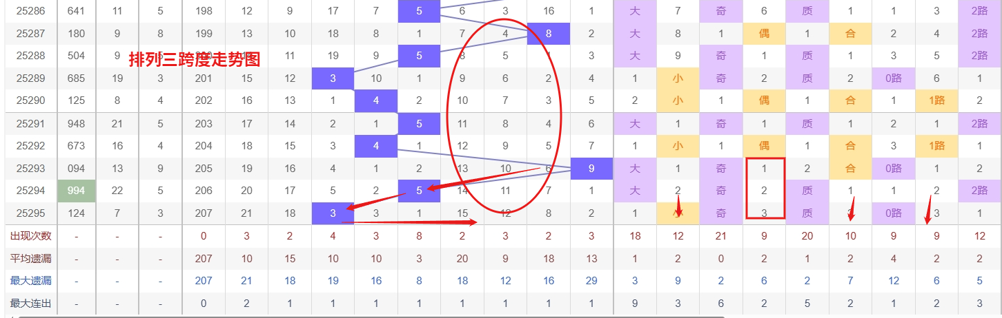 排列三 跨度分析:从上图可以看出近100期的跨度大小比约为47比53,跨度奇偶比约为45比55总体来看还是比较均衡的,但跨度大小之间有点差异。我们再从历史开出3跨后下一期6跨度数据来做参考。最近10期跨度大小比约为6:4期开出大数跨度过多返回小数跨度的概率更高一点。历史开奖近2期出3跨以后的走势为218期开出3跨后下一期走6跨走出3振幅,第227期开出3跨后下一期走8跨走出5振幅第232期开出3跨后下一期开出4跨走出1个振幅。连续多期大振幅。近期排列三跨度走势来观察,2跨和6跨均已进入明显的冷态周期,遗漏值逐渐逼近历史极值。这种长期的沉寂往往意味着其蓄积的反弹动能正在不断增强,从概率均衡的角度看,冷号回补是必然事件,只是时间问题。因此,当前阶段对2跨和6跨保持高度警惕,它们随时可能结束冷冻状态突然开出。在追热号的同时,要分出一部分精力对这两个冷跨度进行防守,综合以上分析后得出,本期预计跨度遵从历史会走出大振幅,出3跨度后容易走出1到5个跨度振幅的对称形态,跨度走出1到5个振幅看好的跨度有2468跨,所以第2025296期排列三跨度推荐2468跨。
