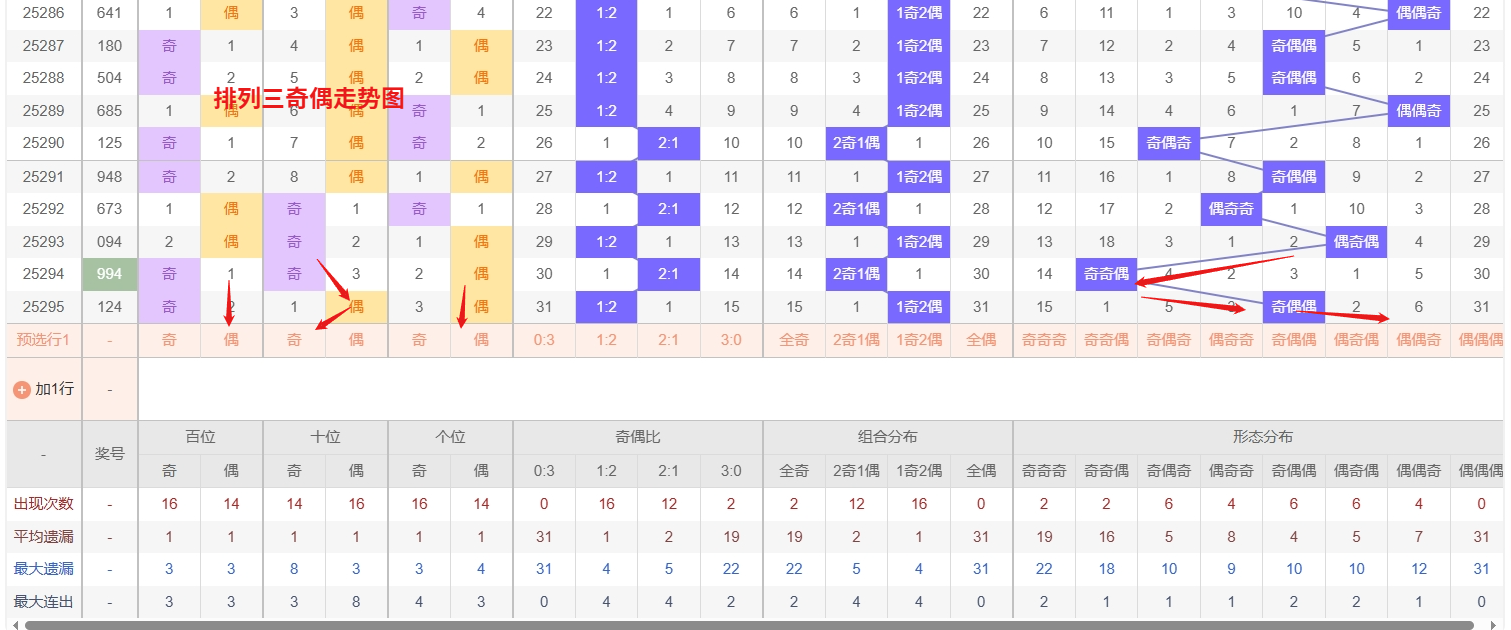 排列三 奇偶分析:从上图可以看出排列三100期内百位奇偶比约为55比45,十位奇偶比为49比51,个位奇偶比为48比52,十位的比值比较均衡,但是百位的比值偏差就有点大,历史奇偶形态近2期开出奇偶偶后下一期的走势为,第218期开出奇偶偶后219期开偶奇偶, 第222期开出奇偶偶后第223期开偶偶偶,第236期开出奇偶偶后第237期开奇奇偶,近期排列三奇偶走势分析,整体呈现明显的冷热分化特征。一方面,“偶偶偶”组合已持续多期未见踪迹,其遗漏值攀升至相对高位,从概率均衡与冷号回补的规律来看,该组合正处于反弹临界点,极有可能在近期出现回补,需要重点关注其解冻信号;另一方面,“偶奇偶”组合作为当前热号表现相当活跃,形成较强的热度延续态势,这种强势表现预示着短期内仍有继续开出的可能性,采取“防热盯冷”的复合策略,在警惕热号“偶奇偶”持续发力的同时,更要密切跟踪冷号“偶偶偶”的回补动向,所以排列三2025296期奇偶形态推偶奇偶与偶偶偶。